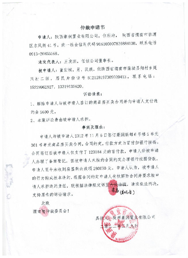 陜西豪潤置業(yè)有限公司與董宏斌一案公告