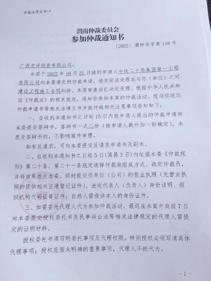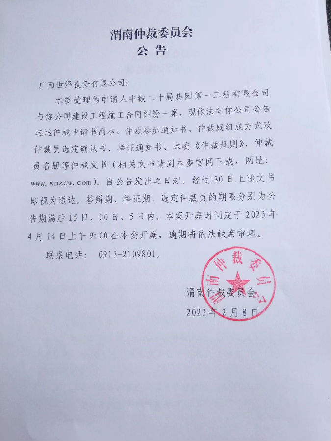 中鐵二十局集團(tuán)第一工程有限公司與廣西世澤投資有限公司一案公告